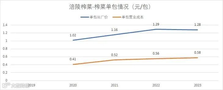 目前涪陵榨菜标准包装是70g/包,那么一吨大约就是14285包。按涪陵榨菜财报披露的相关数据计算,2023年涪陵榨菜每包出厂价约为1.28元、每包营业成本约为0.58元,对应毛利率54.68%,与财报披露的榨菜54.78%的毛利率相当。