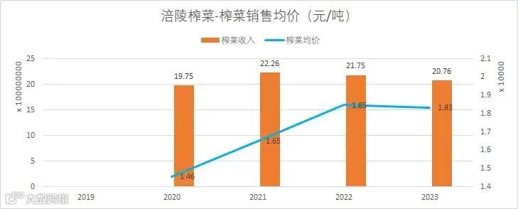 同期,涪陵榨菜的出厂销售均价,先是从2020年的1.46万元/吨经过连续两年的涨价,涨到2022年的1.85万元/吨,然后2023年降至1.83万元/吨。