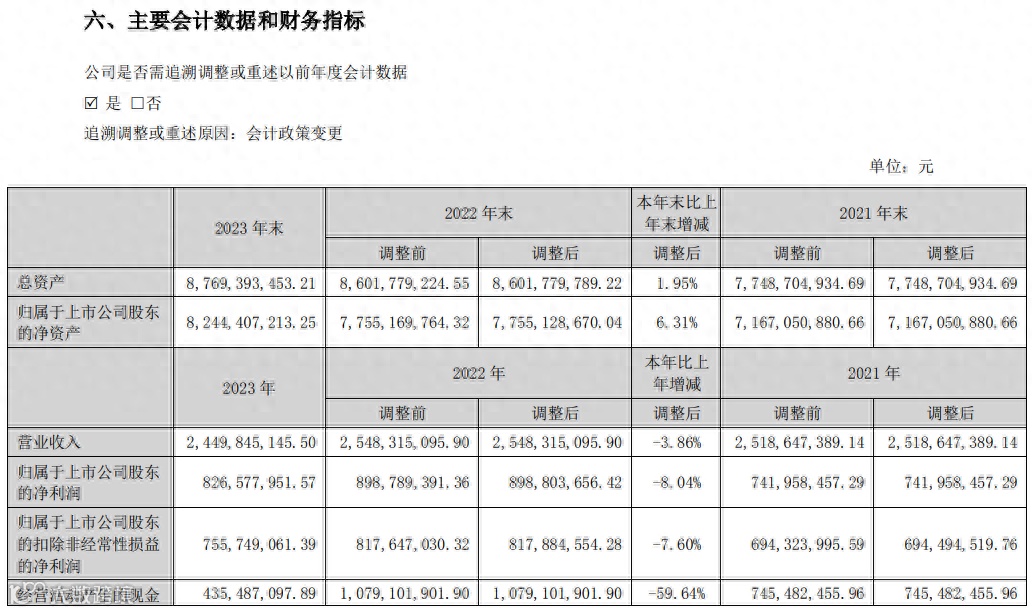 2023年,涪陵榨菜营收24.5亿、同比下滑3.86%,净利润8.27亿、同比下降8.04%,扣非净利润7.56亿、同比下滑7.57%,实现经营现金流净额4.35亿、同比下滑59.64%。