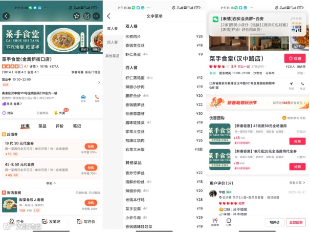 为了吸引更多顾客,菜手在四人餐上进行了优惠,统一降价至79元。为了进一步提升客单价,还推出了45元抵50元和18元抵20元的全场通用代金券。经过这些优惠措施,每人客单价大约在23元左右。