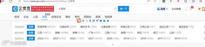 根据企查查显示,现存续的土菜馆企业有104940家,其中有52771家存在风险,在风险类别中其中经营异常的有45211,被行政处罚的有3223家。造成这样原因有很多种,最重要的原因是该市场的竞争已经异常激烈。造成这种现象的理由我认为有二种: