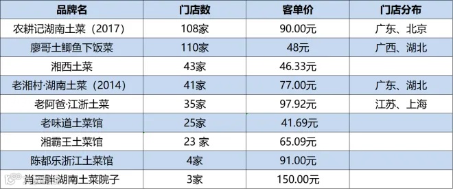 如北京有农耕记·湖南土菜、江西土菜馆、湘本味·围炉土菜;上海有徽记土菜、南陵人家经典土菜、山沟沟土菜馆;广州则有张家界土菜馆、洞庭土菜馆、湖南土菜馆;西安有建辉湖南土菜馆、民间粮仓土菜馆;成都有有滋有味土菜馆、简朴寨土菜馆、乡巴佬土菜馆。
