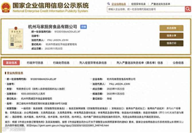 国家企业信用信息公示系统显示:11月22日,杭州马家厨房食品有限公司成立。
