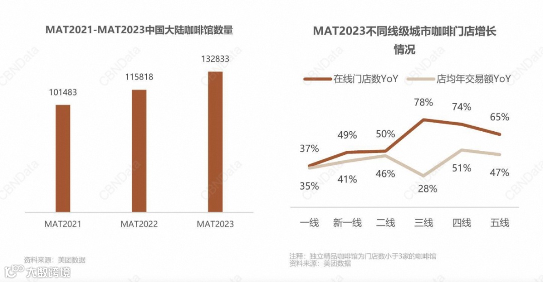 第一财经商业数据中心和美团发布的《2023中国城市咖啡发展报告》显示,MAT(月滚动年销售趋势)2023年,在线门店数增长最快的是三线、四线和五线城市,分为为78%,74%和65%。