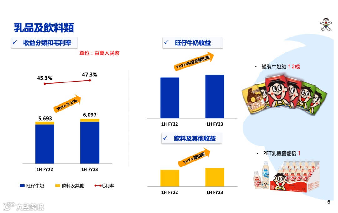 期内,收益112.7亿元,同比增长4.1%;权益持有人应占利润17.3亿元,同比增长8.5%。按业务看,乳品及饮料类得益于销量增长(其中“旺仔牛奶”收益同比增长中至高个位数,主要受益于罐装牛奶同比成长约两成),带动收益增加7.1%至约61亿元,米果类增加4.5%至20.6亿元,休闲食品类收益下降1.5%。