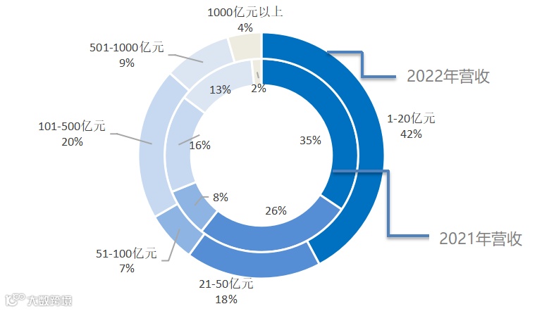 2022年的企业营收数据与2021年相似,50亿元营收以内的企业占比约六成;100亿元以上的企业仅占比三成多,其中100-500亿元的企业占比相较2021年有所增加,达20%,500亿元以上的企业仍较少,仅有13%。