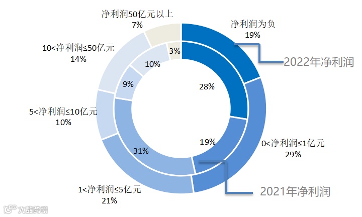 根据已披露数据,2021年,净利润为负数的企业占比接近三成;净利润不足1亿元的企业占比近20%。2022年,净利润为负数的企业占比有所减少,接近二成;净利润不足1亿元的企业占比近三成;净利润10亿元以上的占比明显增加,高于20%。