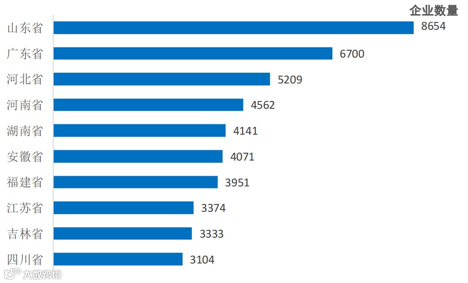 图2-4 预制菜企业数量Top10省份(截至2022年12月31日)(图表数据来自毕马威《2022年中国餐饮企业发展报告》)