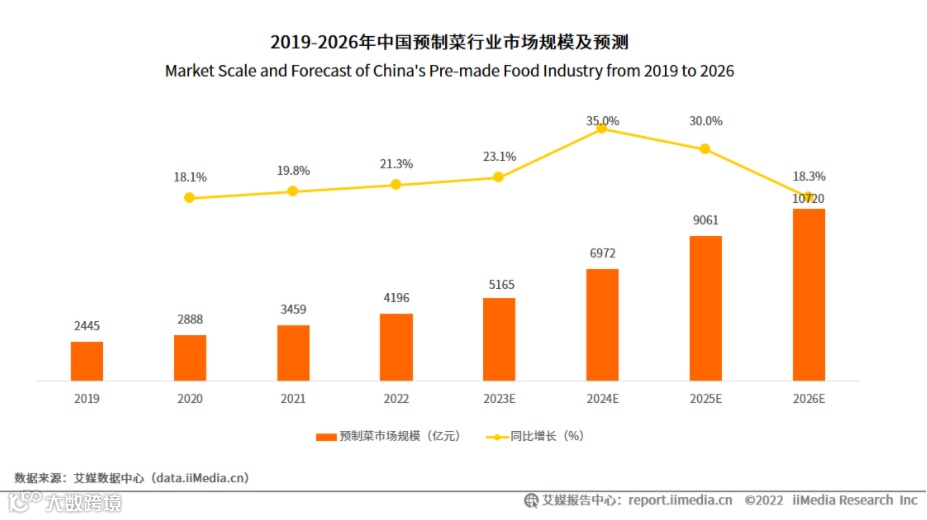 预计未来3-5年,中国预制菜市场规模有望以20%左右的高增长率逐年上升,在2023年达到5165亿元,在2026年达10720亿,我国预制菜产业有望发展成下一个万亿级市场。