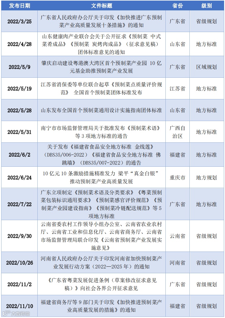 2022年5月,江苏省餐饮服务标准化技术委员会、江苏省餐饮协会牵头发布《预制菜点质量评价规范》团体标准;2022年11月,重庆市市场监管局发布预制菜生产经营《落实食品安全主体责任二十条》;2023年1月,上海市市场监督管理局关于发布《上海市预制菜生产许可审查方案》的通知等。