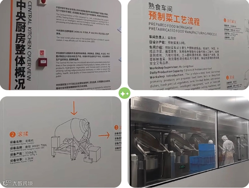 全车间工人生产流程,参观者透明可见,就像超市一样,名厨亮灶,走廊墙上公示着详细的生产流程以及设备型号。