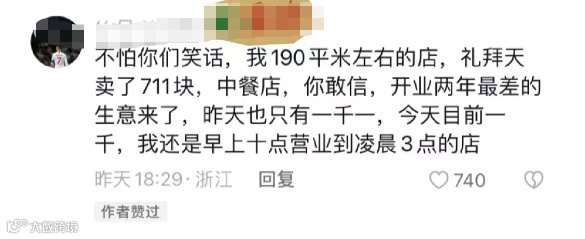 “刚刚打破了5年来最低营收记录。”“不怕你们笑话,我190平米左右的店,礼拜天卖了711块,中餐店,你敢信,我还是早上10点营业到凌晨3点的店。”