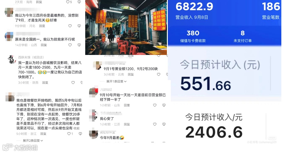 “八月份还是生意好好的,九月份一下悬涯式滑落谷底,”一个网名叫“饼不一样”的餐饮人这样写道。“开奶茶店,比7月份掉了50%。”一个茶饮老板反馈。