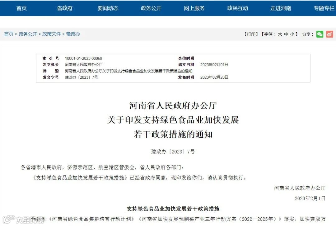 2月20日,河南省人民政府办公厅发布《支持绿色食品业加快发展若干政策措施》,“真金白银”支持绿色食品业发展,加快建成万亿级现代食品集群。