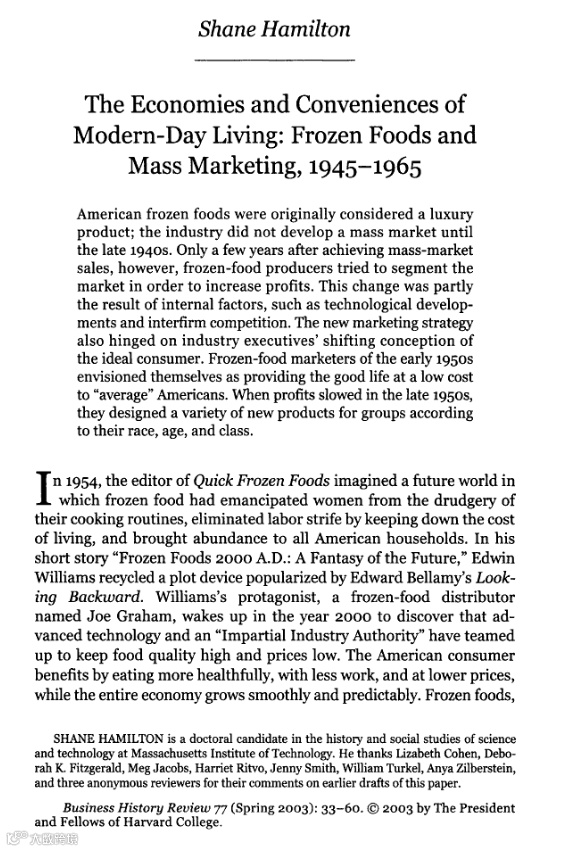 “冷冻食品在美国最初是奢侈品”《商业历史评论》季刊截图