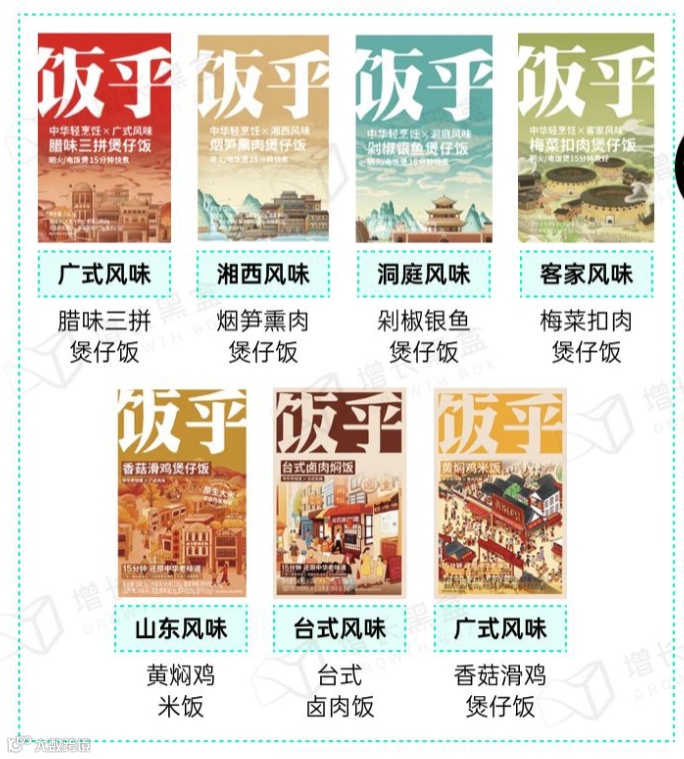 饭乎目前形成的产品矩阵就是各种风味的煲仔饭(广式、湘西、洞庭、客家、台式等),即使拓煲仔饭以外的品类,也持续围绕米饭做文章,开辟以米饭为基础的地方特色传统美食(如砂锅粥、焖饭等)。