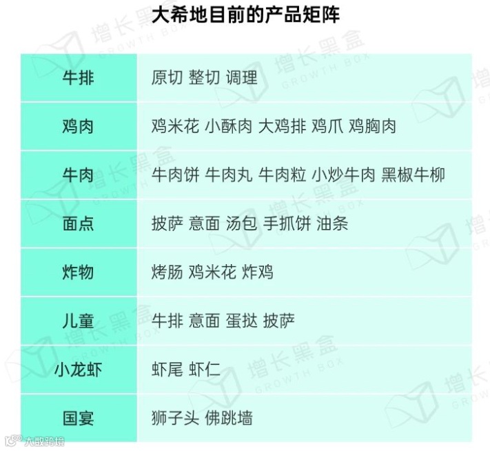 其次是大希地,一个以中式调味牛排为起点,重点围绕家庭烹饪场景,逐渐拓展出牛排、鸡肉、牛肉、面点、炸物、小龙虾、国宴、儿童餐等多品类的预制菜品牌。