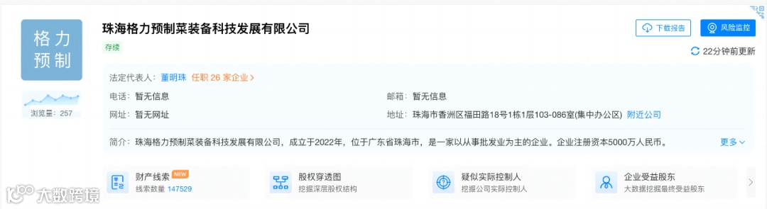 12月8日,珠海格力预制菜装备科技发展有限公司成立,法定代表人为董明珠。注册资本5000万元人民币。