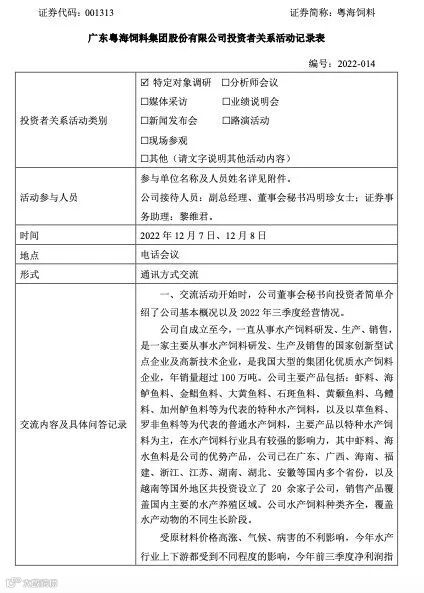 广东粤海饲料集团股份有限公司12月10日发布公告称,公司于12月7日、12月8日接受了多家机构投资者的特定对象调研。