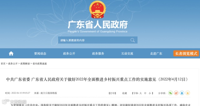 6月10日,中共广东省委、广东省人民政府发布《关于做好2022年全面推进乡村振兴重点工作的实施意见》。