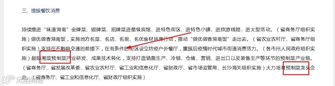 6月9日,湖南省下发了《关于进一步促进消费持续恢复的若干措施》,文件第三条特别提及“提振餐饮消费”,其中一个亮点“(各市州人民政府组织实施)鼓励湘菜预制菜产业研发、成果技术转化,支持打造涵盖生产、冷链、仓储、营销、进出口以及装备生产等环节的预制菜产业链。”