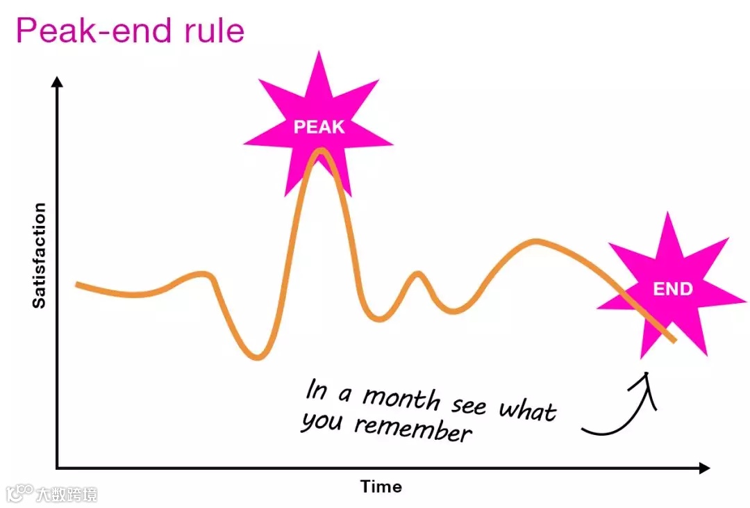 2002年诺贝尔经济学奖获奖者,心理学家丹尼尔·卡纳曼(Daniel Kahneman)经过深入研究,发现我们对体验的记忆由两个因素决定:高峰(无论是正向的还是负向的)时与结束时的感觉,这就是峰终定律(Peak- End Rule)。