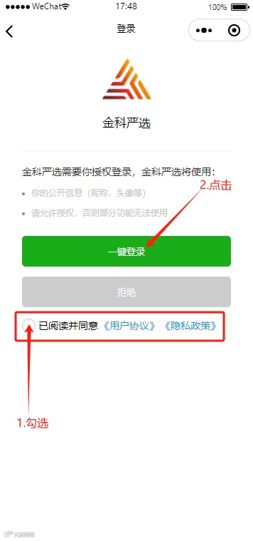 2.在登录页面,阅读并勾选“已阅读并同意《用户协议》《隐私协议》”选项,然后点击一键登录按钮,小程序会申请绑定当前微信的手机号。