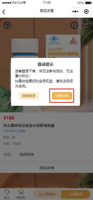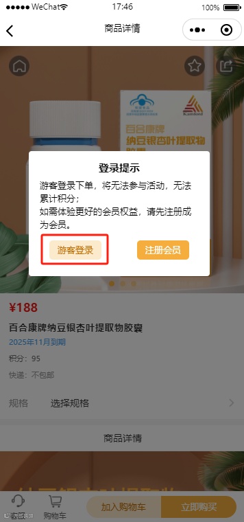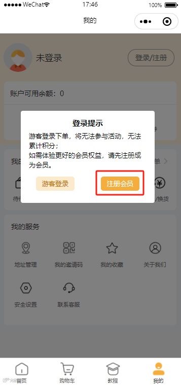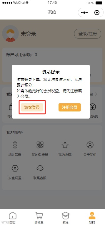 1.新用户在首页右下角【我的】页面,点击右上角【登录/注册】按钮时,或在选择任意商品下单时,小程序会弹窗询问用户要以游客身份登录还是要注册会员,选择游客登录进入登录页面;