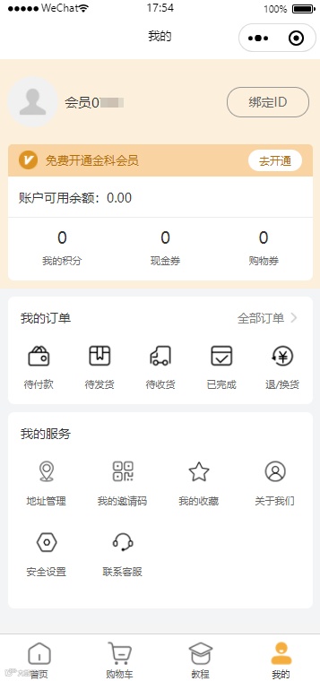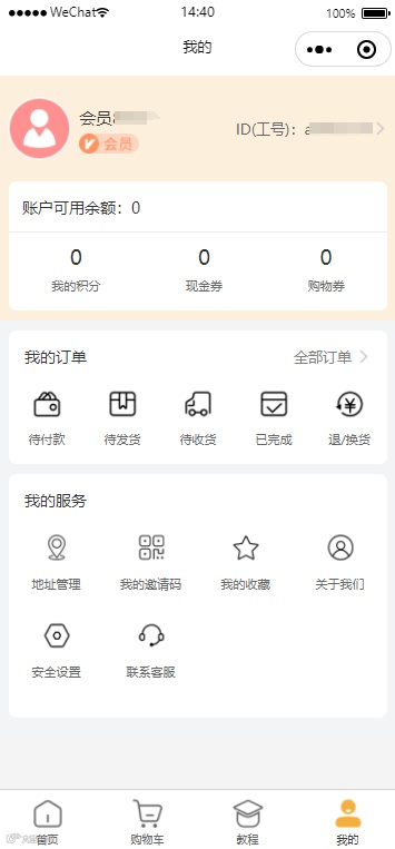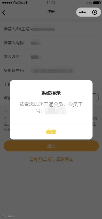 3.填写完毕后点击提交,注册成功后会弹窗显示申请到的会员ID,点击确定后自动跳转到“我的”页面,右上角显示的是注册后获得的ID,会员昵称默认是“会员+手机后4位数”,点击头像可修改昵称和头像,注册会员成功后您进行消费即可累计积分。
