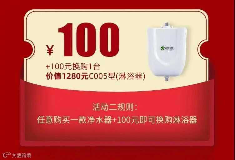 只要在活动期间购买指定任意净水器再加100元,就能额外获得价值1280元的淋浴器一台。