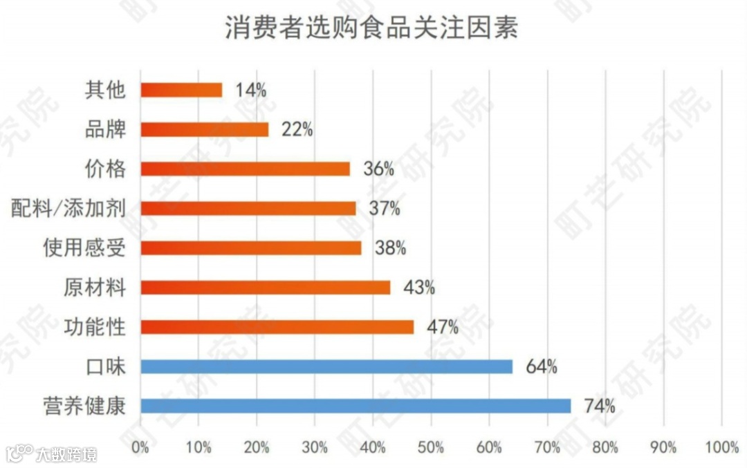或者主打“健康营养”定位打动消费升级群体。据町芒研究院相关数据显示,在选购食品的关注因素上,营养健康的重要性已经排名第一。