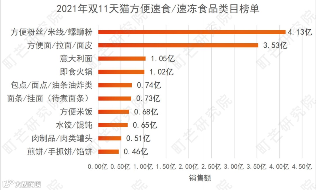2021年双十一期间,螺蛳粉等方便粉丝已经超越方便面等大类,以4.13亿的销售额位列天猫的方便速食榜单第一。
