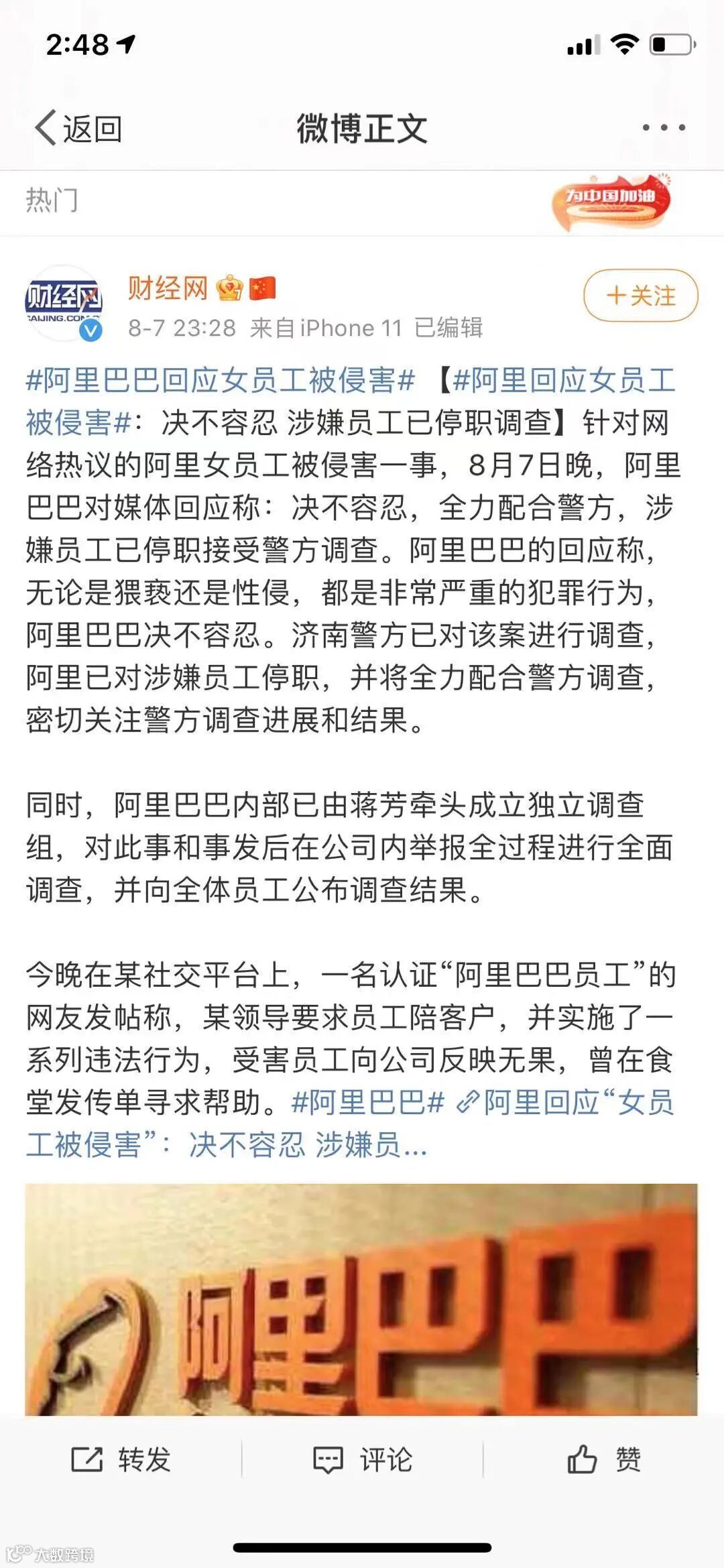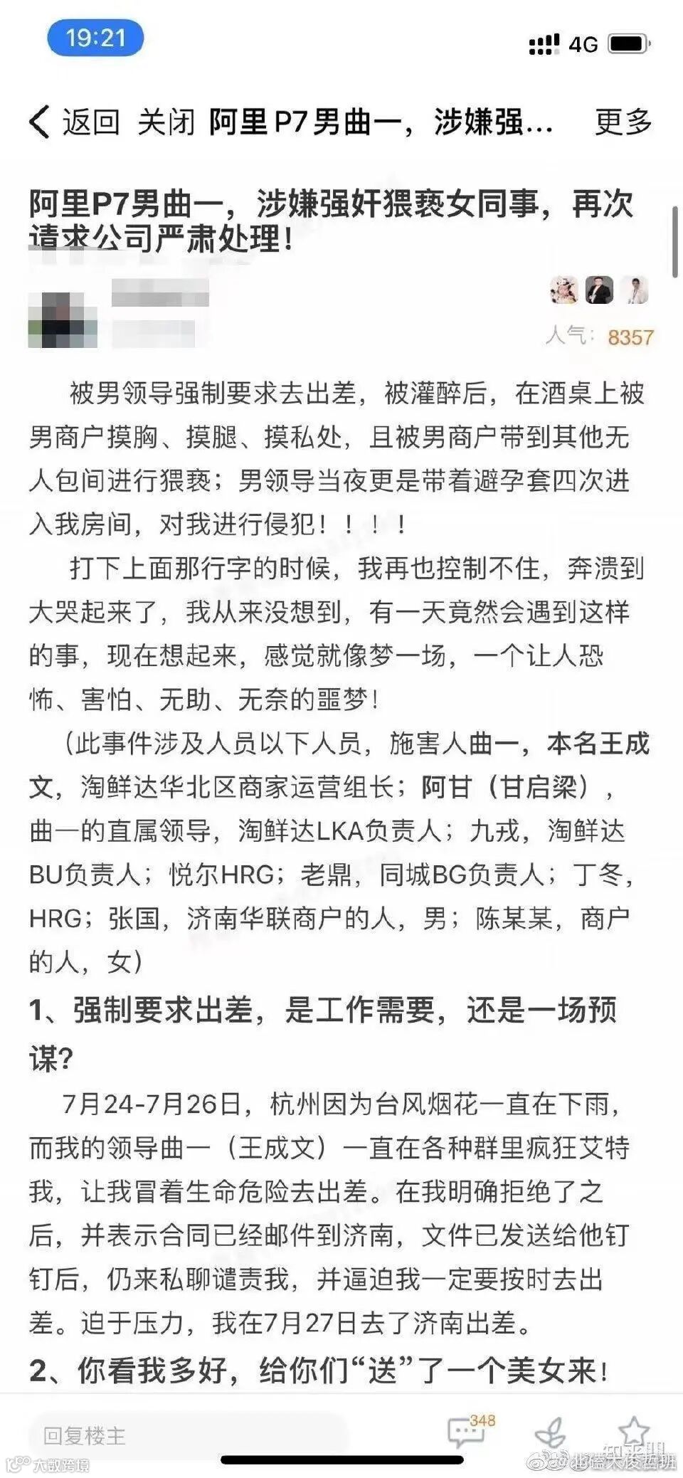 8月7日,阿里巴巴一名女员工在微博平台发文称,自己7月底与上级领导前往