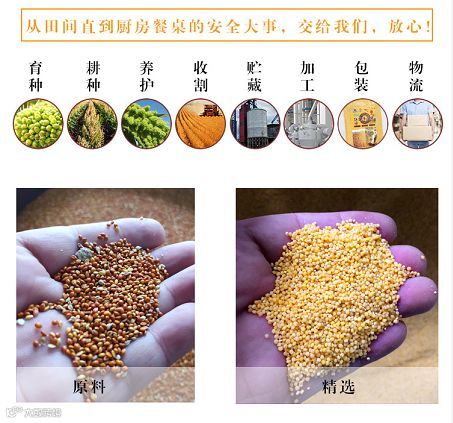 得天独厚的自然条件、传统古老的耕作方法、和谐的生态环境造就了望原小米非同一般的口感。而神鹰农业对小米从种到收过程的严格把控更是用心良多,收获晾晒时要求农户注意晒场卫生,为了确保品质,我们不会收购农家自碾的小米,我们的小米全部是从农户家里收购的当年新鲜无霉烂、杂质少、无石粒的小米,然后统一在国机扶贫加工厂的小米生产线上加工。先进的生产线最大限度地减少了谷子的破碎,最大程度保留了谷子的营养成分,这是红谷子小米品质保障的关键环节。