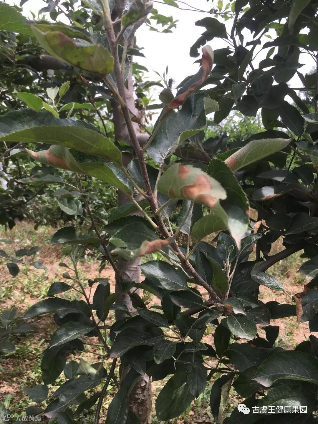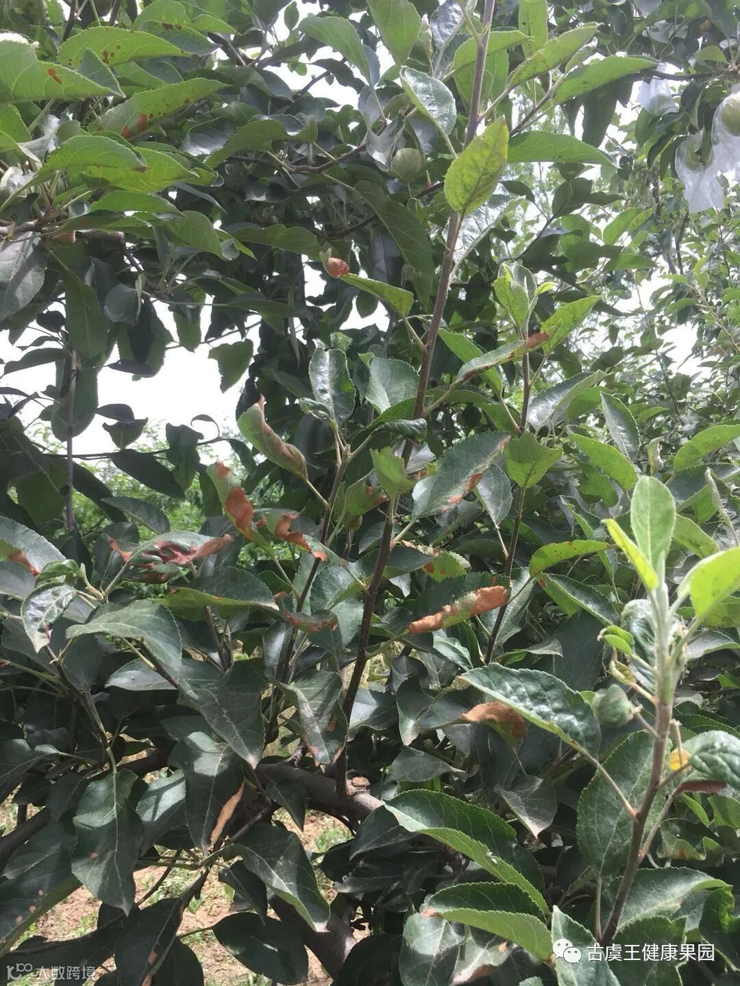 在计都村周杨军的果园里,老周向大家展示了自己的顾虑:这几棵嘎啦树的叶子不知何故出现了大面积损伤。技术骨干王军帅通过现场仔细查看,并详细询问老周有关情况,终于找准了“病因”——这是因为他没有按照使用说明,向嘎啦果树喷施了青岚所致。