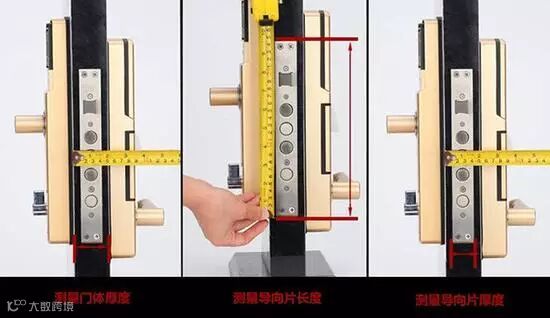 测量导片长度、宽度及门厚度--通过这组数据可以确定您家原有锁体的大小,并根据厂商可提供的门锁进行适配。也现有锁体大小(不同厂家对尺寸要求也有不同)
