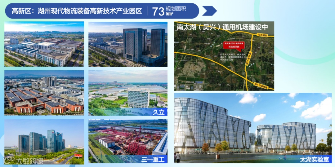 湖州现代物流装备高新技术产业园区:吴兴最主要的工业平台,总规划面积73 平方公里,以 G50 高速路口为界分为南北两片,2024 年在全省开发区(园区)综合考核中位列第五;