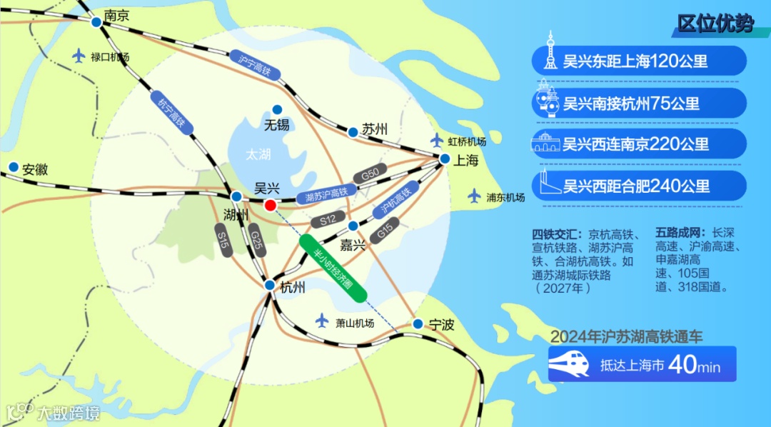 从空间距离看,吴兴东距上海120 公里、南接杭州 75 公里、西连南京 220 公里、西距合肥 240 公里,紧密衔接沪杭宁合四大都市,可快速共享核心城市的人才、技术、市场资源。交通网络更是 “四铁交汇、五路成网”:京杭高铁、宣杭铁路、湖苏沪高铁、合湖杭高铁构筑起便捷的铁路通道,2024 年沪苏湖高铁通车后,40 分钟即可抵达上海;长深高速、沪渝高速、申嘉湖高速、105 国道、318 国道形成密集公路网,加上建设中的通苏湖城际铁路(2027 年),全方位打通了内外联通的 “动脉”,让物流、人流、资金流高效流转。