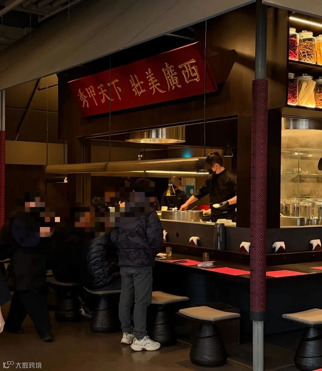 为了直观传递 手作 与地域特色,门店设置了日式开放式厨房,上方墙面陈列着装有红辣椒、姜片等广西特色食材的玻璃罐,桌垫上也印有广西地标及物产关键词。