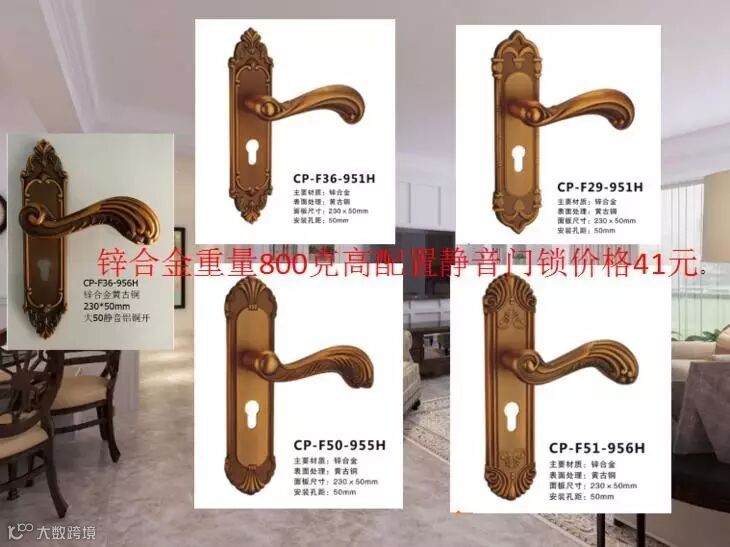 家庭装修一般都比较讲究,那我们要用什么锁呢太好了我们不合适,因为我们很多店里都是买门送锁。现在生意难做,一扇门本身利润就不高,送太好的不合适,太低的又不配门,那我给你们以下几款,重量又可以达到高档 锁的重量,配置又是高档锁的配置,价格却是中档锁的价格。