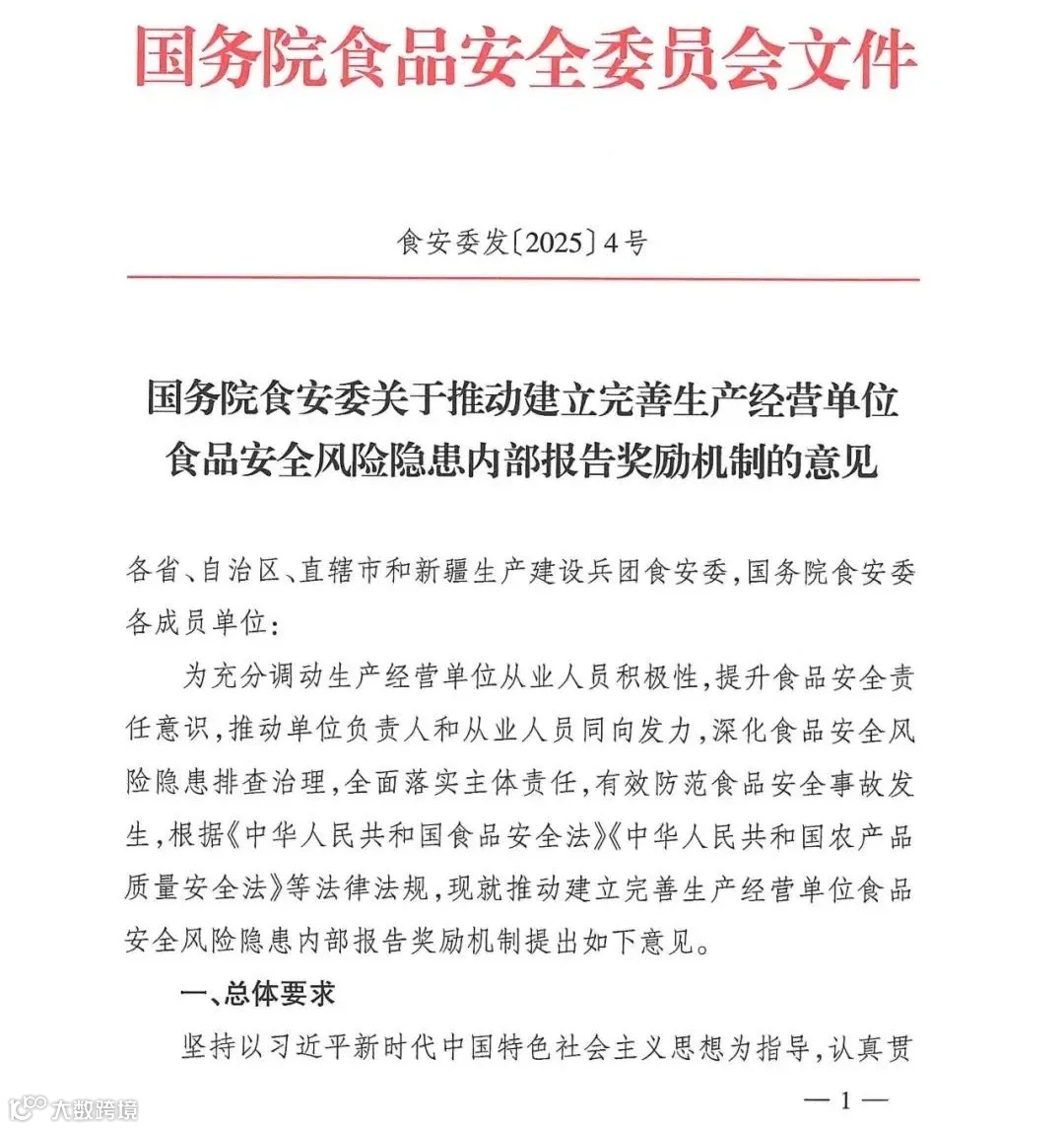 近日,国务院食安委发布《关于推动建立完善生产经营单位食品安全风险隐患内部报告奖励机制的意见》,发挥食品从业人员“内部知情人”作用,鼓励其主动参与监督,推动生产经营单位落实食品安全主体责任,有效防范风险隐患。