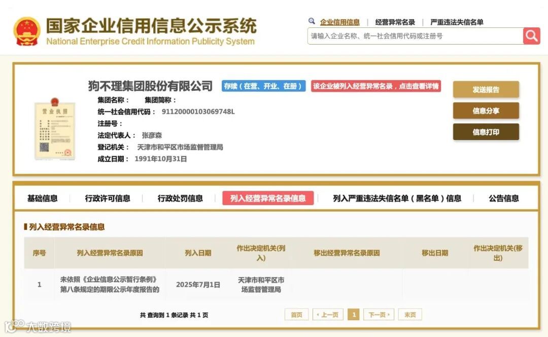 近日,狗不理集团股份有限公司因未依照规定的期限公示年度报告,被天津市和平区市场监督管理局列入经营异常名录。