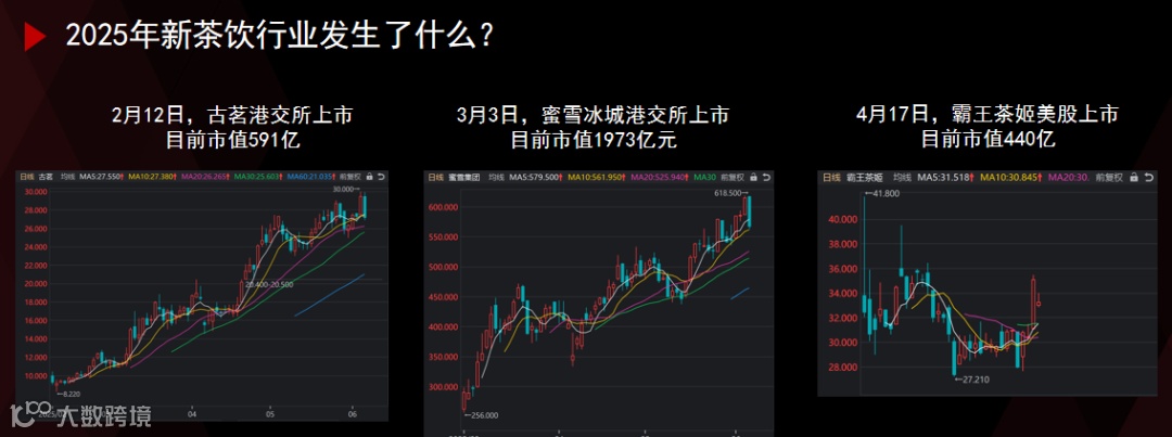 2月12日,古茗港交所上市目前市值591亿;3月3日,蜜雪冰城港交所上市目前市值2003亿元;4月17日,霸王茶姬美股上市目前市值440亿,5月8日,沪上阿姨港交所上市目前市值180亿。