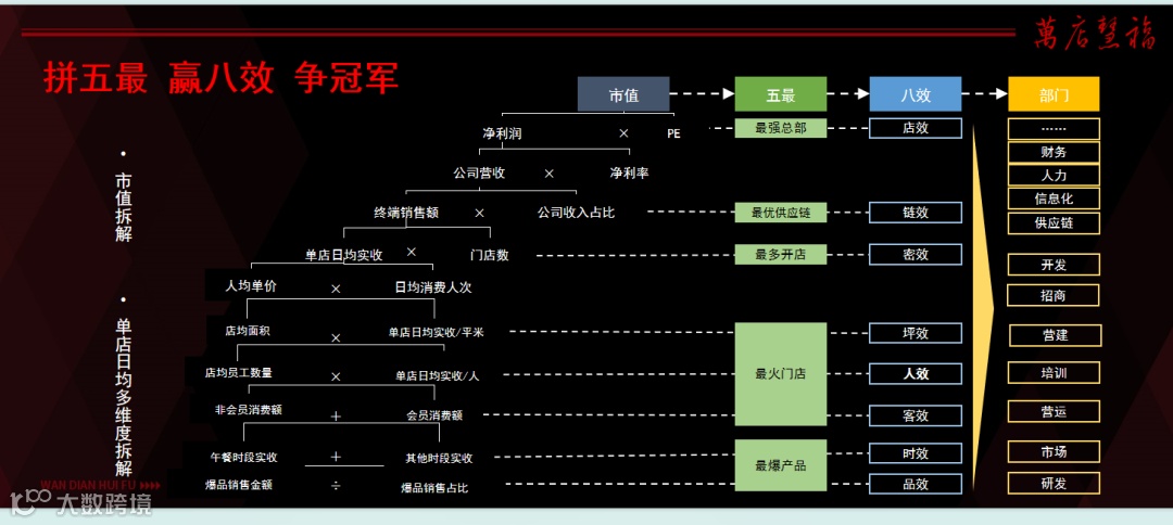 其中,最爆产品×SKU数=最火门店,最火门店×最多开店=收入,收入减去最优供应链的成本就是毛利,毛利减掉最强总部的成本就是净利。