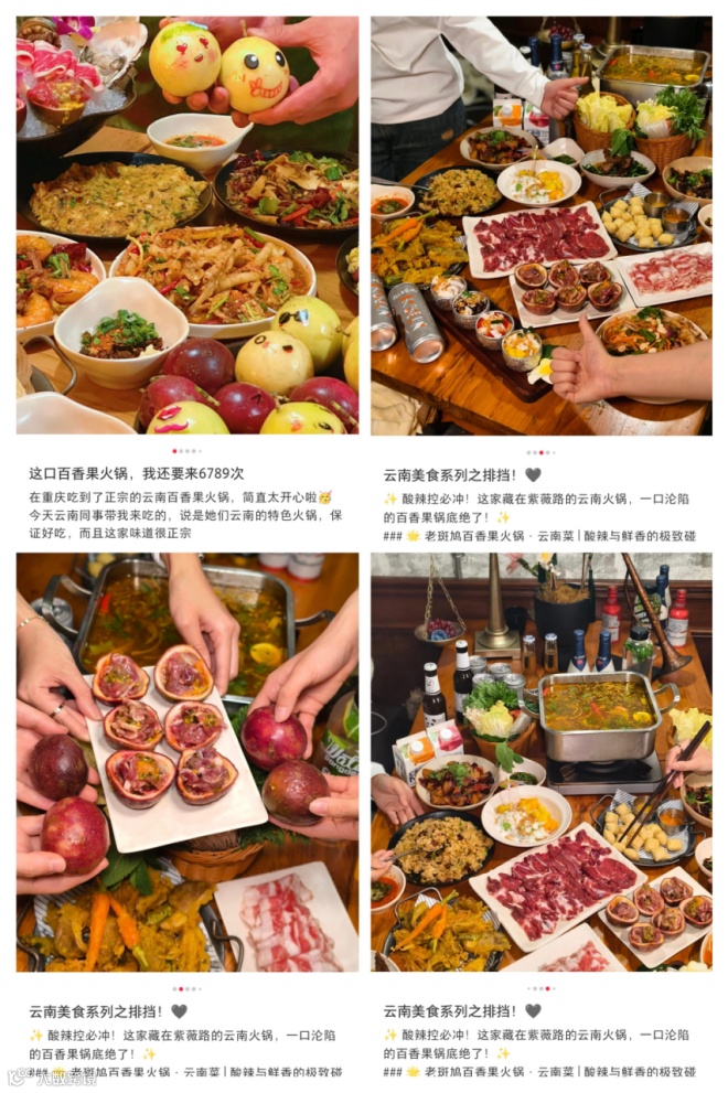而重庆则有老斑鸠百香果火锅・云南菜,其招牌锅底用百香果和牛骨高汤每日新鲜熬制,每锅放入 8 颗新鲜百香果,用料十分充足。