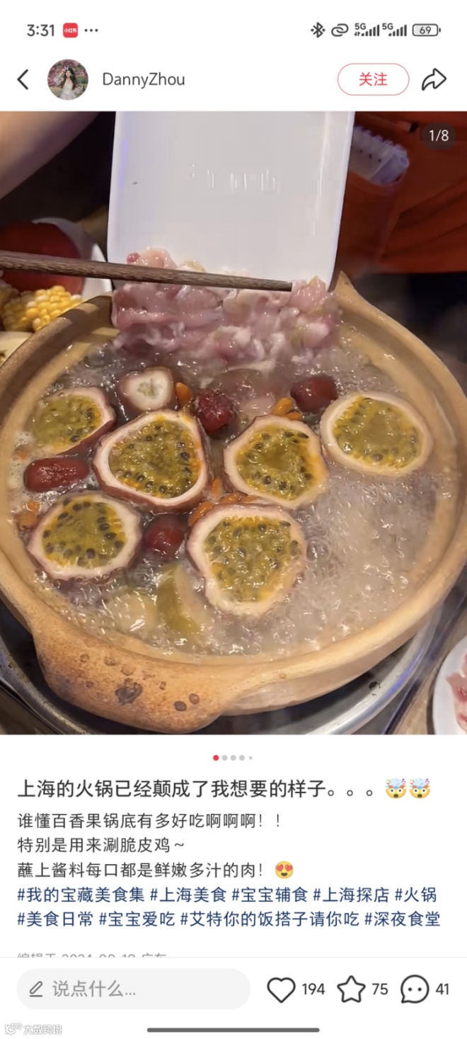而在 2023 年前后,不少火锅门店开始以百香果为核心原料,将其与酸汤、骨汤和椰果等融合制成锅底,推出了主张 “先喝原汤”,酸味和果味十足的百香果锅底。