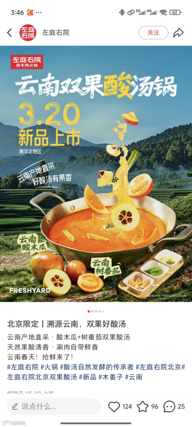 左庭右院春季上新的云南双果酸汤锅,以酸木瓜、树番茄为核心,搭配木姜子、大香菜提味,涮煮牛肉时能赋予肉质独特果香。
