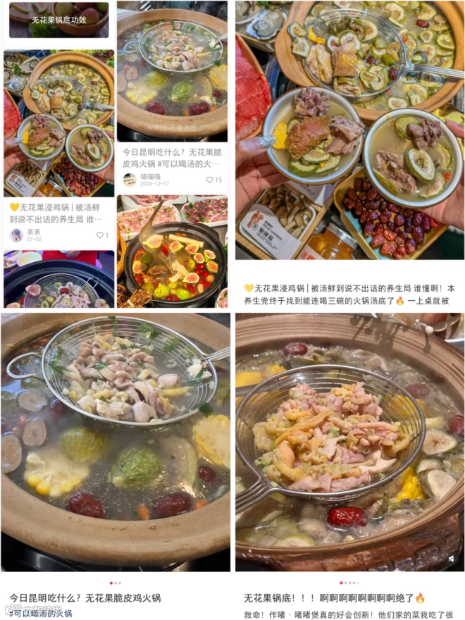 如位于昆明的青犊百香果火锅,在牛油火锅占据主导地位的当下,率先以云南元谋的百香果为特色,用 7.8% 天然果酸搭配牛骨高汤,打破了传统火锅 “重辣重油” 的印象。