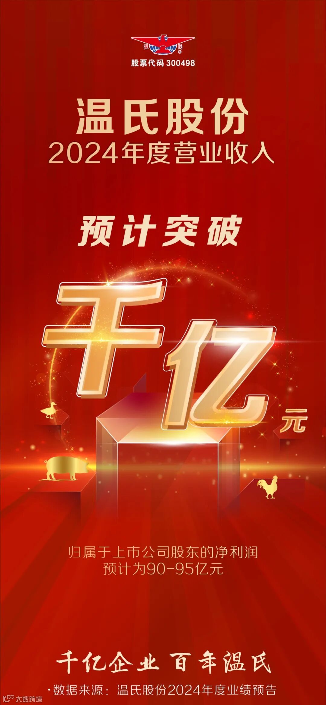 日前,温氏股份发布了2024年度业绩预告,预计2024年营业收入超过1000亿元。这也是温氏股份上市以来首次突破1000亿元营收规模。同时,该预告显示,温氏股份预计2024年归属于上市公司股东的净利润为90亿—95亿元,扣非净利润为93亿—99亿元,实现扭亏为盈