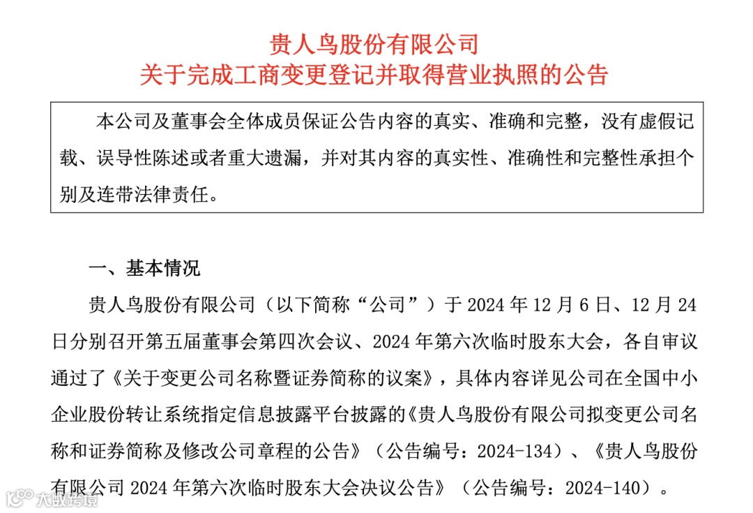 国家企业信用信息公示系统显示,2025年1月9日,贵人鸟股份有限公司(以下简称为“贵人鸟”)名称变更为金鹤农业股份有限公司(以下简称为“金鹤农业”)。